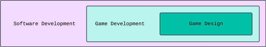In my experience, I believe that there is no one correct approach to teaching Games Design, in fact more “flavors” of teaching should be available. But the difficulty of the correct approach comes from the fact that Games Design cannot exist without Game Development, which itself is part of Software Development. (Please see the diagram below)